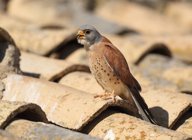 Otro de los objetivos que habíamos seleccionado para fotografiar fueros los cernícalos primillas, que como observareis en las siguientes fotos comparten espacio de cría con las grajillas y los gorriones comunes. Los viejos tejados de las casas de labor son lugares que frecuentemente eligen los primillas para la elaboración de sus nidos y sacar adelante sus polladas.
